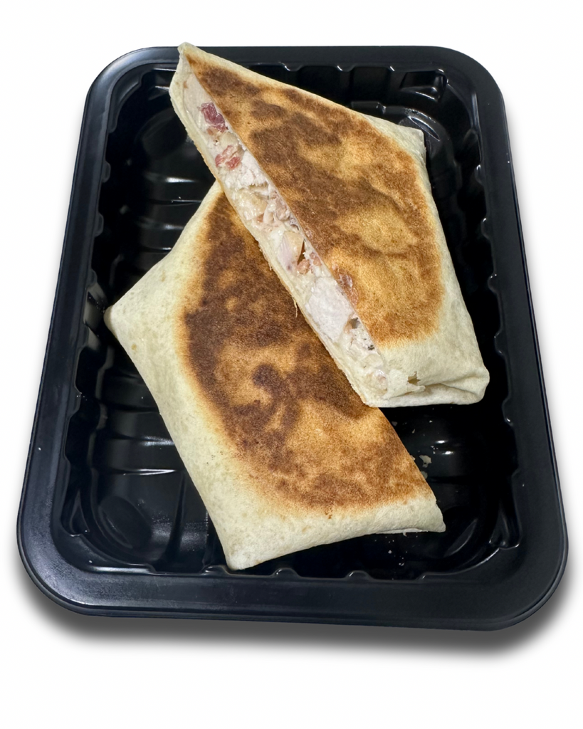 Perfect for breakfast, lunch, or quick pre workout meal! A delicious tortilla, with fajita style chicken, bacon bits, Bacio mozzarella cheese, and fat free ranch all sealed together and seared perfectly!